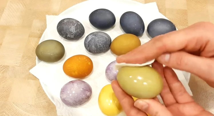 Для блиску пофарбованих яєць і для їх кращого збереження, протираю пофарбовані яйця соняшниковою олією.