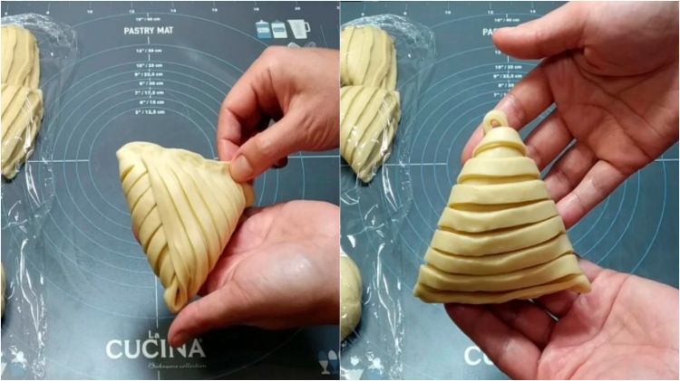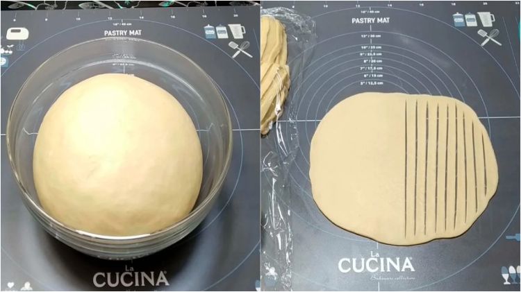 Тісто, що підійшло обминаю і розділяю на 7-8 частин. Кожну частину скачую в кульку і розкачую. Роблю кілька надрізів ножем до середини, але не доходячи до країв, так, як показано на фото.