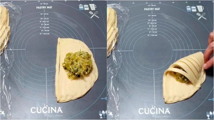 Накриваю тісто з надрізами другою половиною і викладаю начинку.